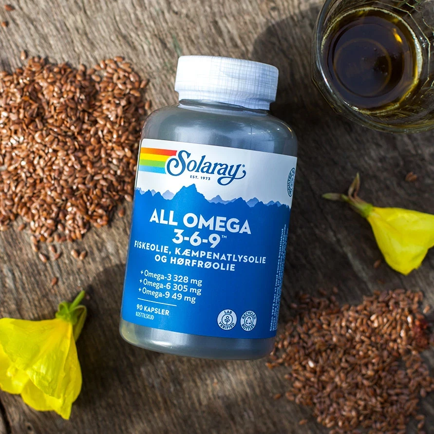 90 kapsler. All Omega 3-6-9 Solaray med kæmpenatlys- og hørfrøolie. Alle fiskeolier er i flg. lovgivningen testet for tungmetaller og pesticider. Kapsel fra kalv. Natur Energi.