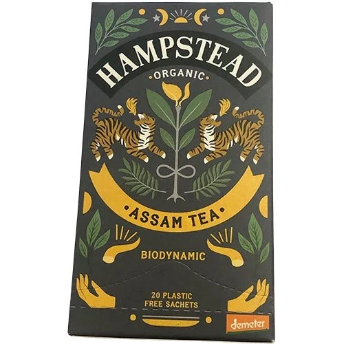 Økologisk og Demeter-certificeret Assam Te fra Hampstead Tea giver fyldig smag med malttoner i plastikfri, Fairtrade emballage.