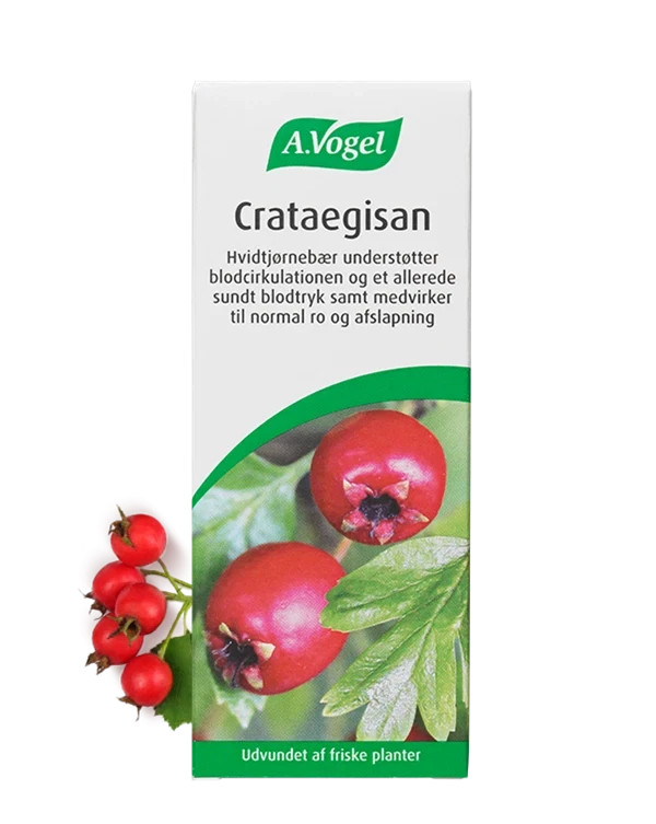 100 ml. Crataegisan A. Vogel kosttilskud, urtetilskud tinktur med udtræk af friske hvidtjørnebær understøtter blodcirkulationen og et allerede sundt blodtryk, afslappende, beroligende. Indeholder alkohol. 1 ml svarer til ca. 40 dråber. A. Vogel.