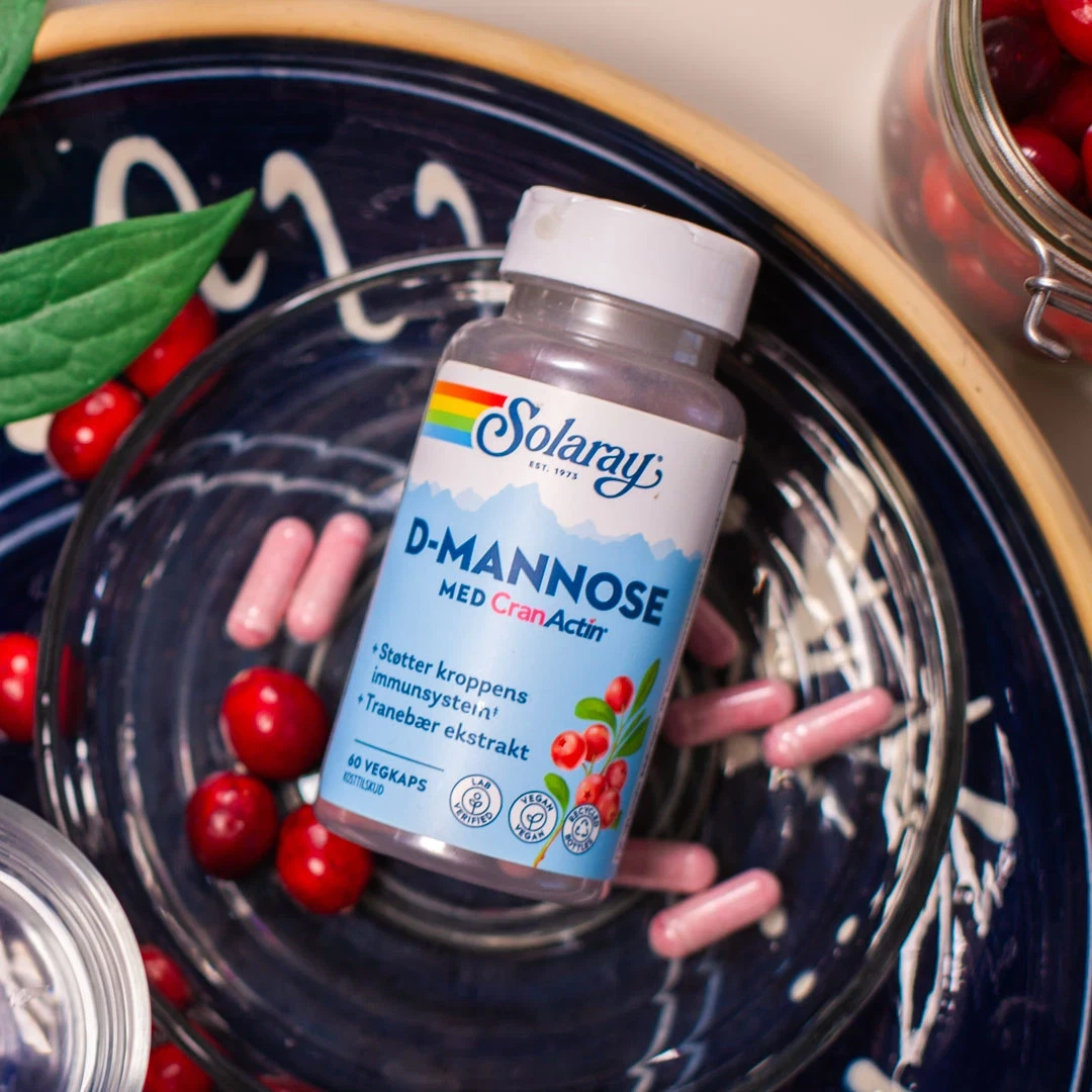 60 vegetabilske kapsler. Kosttilskud. D-Mannose med CranActin Solaray med tranebærekstrakt og vitamin C. Vitamin C bidrager til immunsystemet normale funktion. Bør kun efter aftale med læge eller sundhedsplejerske anvendes af gravide og børn. Natur Energi ApS.