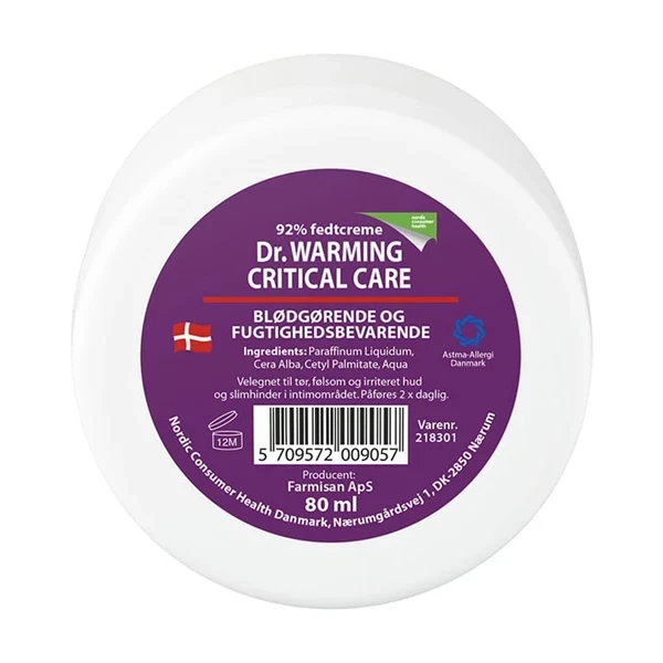 80 ml creme i krukke. Dr. Warming Critical Care 92 % Fedtcreme Body / Intim holder på fugten og bruges mod tør og sart hud på hele kroppen og som blødgørende fedtcreme til behandling af vulva-gener og tørhed omkring vagina. pH 6,0. Ingen paraben, hormon, kortison, emulgator, pH-regulator, farvestof eller parfume. Astma-Allergi Danmark. A. Vogel.