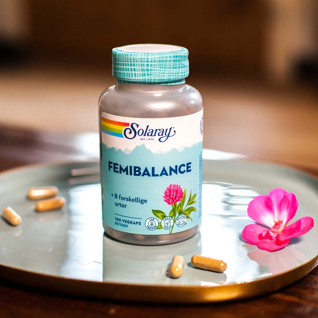 FemiBalance fra Solaray er det naturlige valg til kvinder i overgangsalderen. Denne velafbalancerede kapsel indeholder en nøje udvalgt kombination af urter og vitamin B6 – alt sammen i vegetabilske kapsler.
