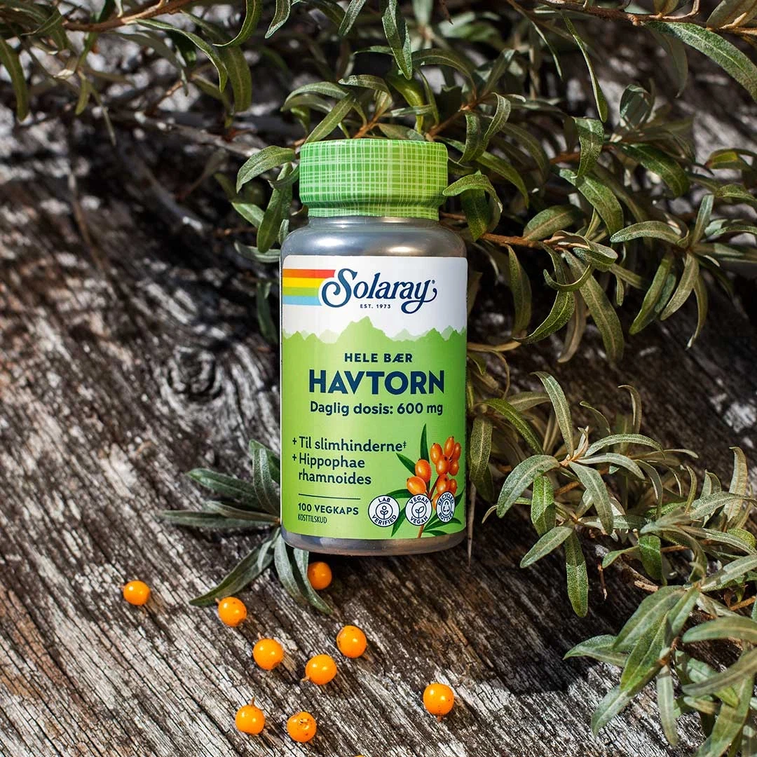 100 vegetabilske kapsler. Havtorn Til Slimhinderne Solaray indeholder Omega-7 fedtsyrer. Velegnet til vegetarer og veganere og andre der ikke ønsker animalske stoffer. Havtorn bør ikke indtages af gravide eller ammende. Natur Energi.
