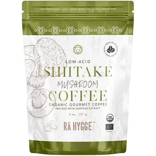 Rå Hygge Økologisk Shiitake Kaffe – lavsyrlig (pH 6,5), hele bønner med 2% Shiitake-ekstrakt. Sund og velsmagende Arabica.