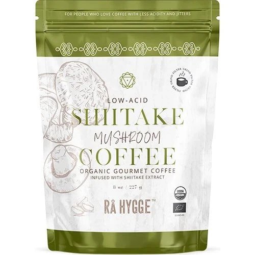 Rå Hygge Økologisk Shiitake Kaffe – lavsyrlig (pH 6,5), filtermalet med 98% Arabica og 2% Shiitake-ekstrakt. Ren umami-smag.