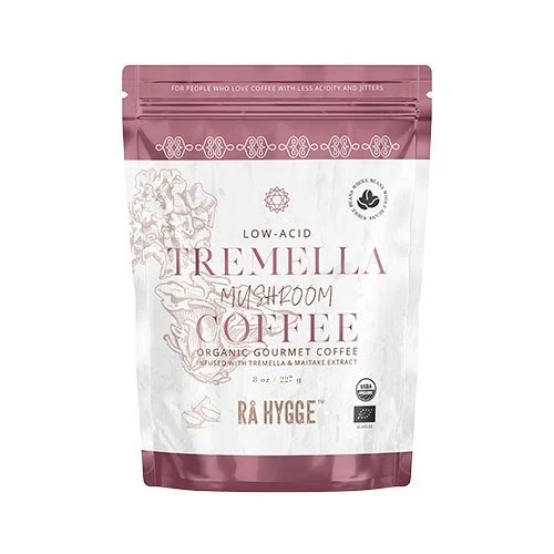 Rå Hygge Økologisk Snow Fungus & Maitake Kaffe – lavsyrlig (pH 6,5), hele bønner med jordagtig smag og svampeekstrakt.