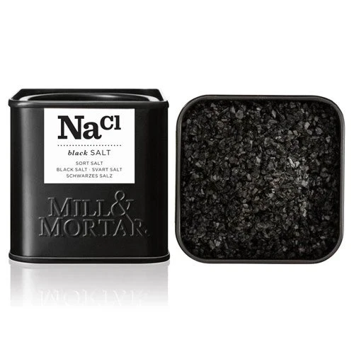 80 g. Sort Flagesalt NaC1 Mill & Mortar giver en flot afslutning til retter med lyse råvarer som grillet kød, fisk, grønsager og æg. Mill & Mortar Trading Company.